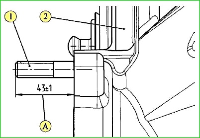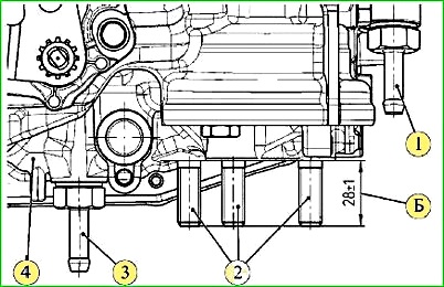 Завернуть, не затягивая гайку 4, с пружинной шайбой шпильки крепления АКП к блоку цилиндров.