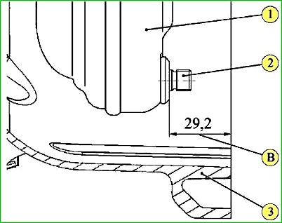 В случае если полученное значение не соответствует размеру B = 29,2 мм, необходимо поворачивая гидротрансформатор ввести его в зацепление с гидронасосом АКП и вновь произвести замеры.