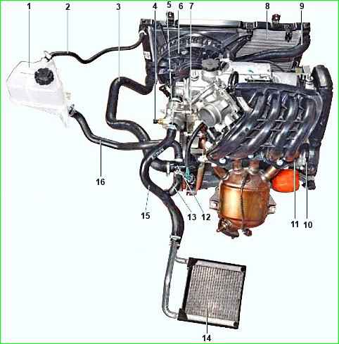 Система охлаждения: 1 - расширительный бачок; 2 - пароотводящий шланг радиатора системы охлаждения; 3 - отводящий шланг радиатора системы охлаждения; 4 - датчик температуры охлаждающей жидкости; 5 - корпус термостата; 6 - вентилятор; 7 - головка блока цилиндров; 8 - радиатор системы охлаждения; 9 - подводящий шланг радиатора системы охлаждения; 10 - насос охлаждающей жидкости; 11 - блок цилиндров; 12 - подводящая труба насоса; 13 - отводящий шланг радиатора отопителя; 14 - радиатор отопителя; 15 - подводящий шланг радиатора отопителя; 16 - наливной шланг