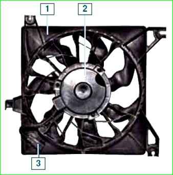Вентилятор с кожухом в сборе: 1 - кожух вентилятора; 2 - крыльчатка вентилятора с электродвигателем; 3 - колодка проводов