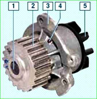 Насос охлаждающей жидкости: 1- валик насоса; 2 - зубчатый шкив; 3 - корпус насоса; 4 - контрольное отверстие; 5 - крыльчатка