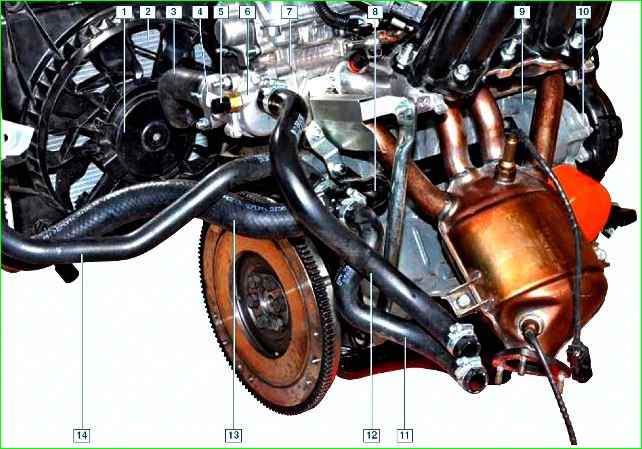 Элементы системы охлаждения: 1 - вентилятор; 2 - радиатор системы охлаждения; 3 - подводящий шланг радиатора системы охлаждения; 4 - корпус термостата; 5 - датчик температуры охлаждающей жидкости; 6 - крышка термостата; 7 головка блока цилиндров; 8 - подводящая труба насоса; 9 - блок цилиндров; 10 - насос охлаждающей жидкости; 11 - отводящий шланг радиатора отопителя; 12 - подводящий шланг радиатора отопителя; 13 - отводящий шланг радиатора системы охлаждения; 14 - наливной шланг