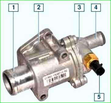 Корпус термостата в сборе: 1 - патрубок для соединения с подводящим шлангом радиатора системы охлаждения; 2 - корпус; 3 - крышка; 4 - патрубок для соединения с подводящим шлангом радиатора отопителя; 5 - датчик температуры охлаждающей жидкости