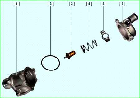 Элементы термостата: 1 - корпус; 2 - уплотнительное кольцо; 3 баллон; 4 - пружина; 5 - фиксирующая пластина; 6 - крышка