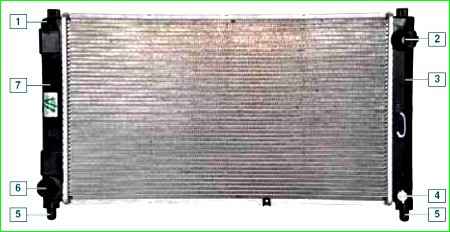 Радиатор системы охлаждения: 1 - штуцер пароотводящего шланга; 2 - патрубок подводящего шланга; 3 - правый бачок; 4 - пробка сливного отверстия; 5 - подушка нижнего крепления радиатора; 6 - патрубок отводящего шланга; 7 - левый бачок