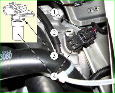 Отсоединяем колодку 1, жгута проводов от датчика 4 скорости автомобиля