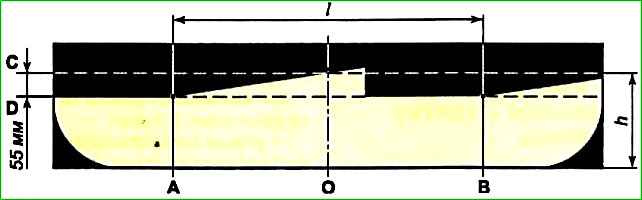 Схема разметки экрана для регулировки света блок-фар: А - вертикальная линия, обозначающая расположение центра лампы ближнего света левой блок-фары; B - вертикальная линия, обозначающая расположение лампы ближнего света правой блок-фары; C - горизонтальная линия, обозначающая расположение ламп ближнего/дальнего света фар; D - линия, обозначающая высоту подъема горизонтальной границы пучков света; О - осевая линия; I - расстояние между лампами ближнего света блок-фар; h - расстояние от поверхности площадки, на которой установлен автомобиль до центра ламп ближнего света фар