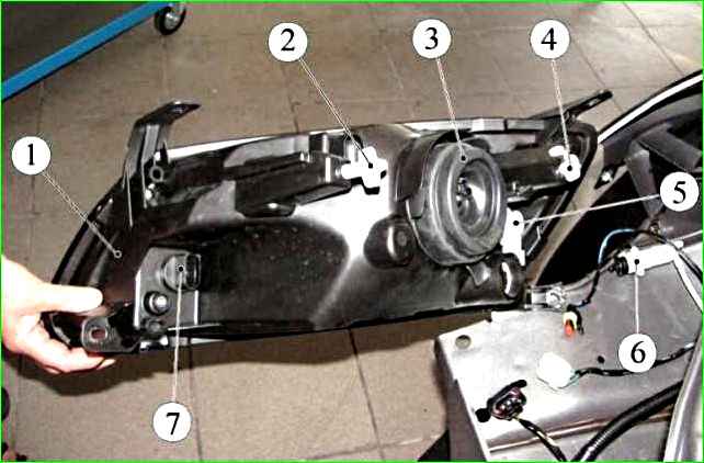 Блок-фара: 1 - блок-фара; 2 - винт регулировки оптического элемента в горизонтальной и вертикальной плоскости; 3 - крышка патрона лампы дальнего и ближнего света; 4 - винт регулировки оптического элемента в вертикальной плоскости; 5 - патрон лампы габаритного и дневного ходового огня; 6 - корректор света фар гидравлический (дет. 21900-3718010-00); 7 - колодка лампы указателя поворота