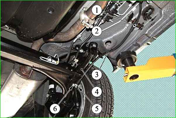 Закрепляем трос в держателях на кузове и кронштейне крепления балки задней подвески