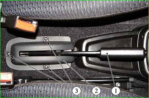 Крестовой отверткой откручиваем три винта 3 крепления чехла защитного рычага ручного привода тормоза