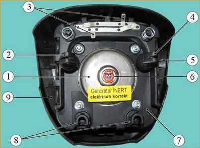 Модуль газогенераторный (вид сзади): 1 - газогенератор; 2, 4 - зацепы для фиксации МНПБВ; 3 - контакты выключателя звукового сигнала; 5 - место расположения идентификационной этикетки; 6 - разъем запала-воспламенителя газогенератора; 7 - корпус, со сложенной в нем надувной подушкой; 8 - зацепы для позиционирования МНПБВ; 9 - крышка облицовочная