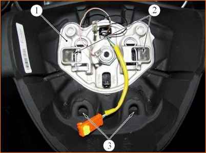 Крючки подушки входят в отверстия в кронштейне для фиксации 2 и фиксируются пружинными фиксаторами. Фиксаторы подушки входят в углубления 3 на рулевом колесе.