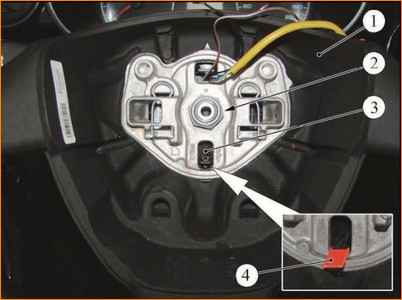 Снятие рулевого колеса: 1 - рулевое колесо; 2 - гайка крепления рулевого колеса; 3 - устройство вращающееся соединителя; 4 - предохранитель транспортировочный