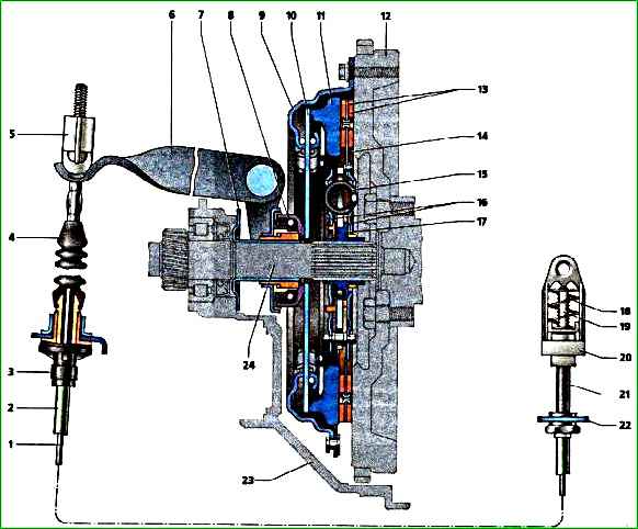 Сцепление и его привод: 1 - трос привода сцепления; 2 - оболочка троса; 3 - нижний наконечник оболочки троса; 4 - защитный чехол; 5 - поводок; 6 - рычаг вилки; 7 - направляющая втулка подшипника; 8 - подшипник выключения сцепления; 9 - кожух сцепления; 10 - нажимная пружина; 11 - нажимной (ведущий) диск сцепления; 12 - маховик; 13 - фрикционные накладки ведомого диск; 14 - ведомый диск; 15 - пружина демпфера; 16 - демпфер крутильных колебаний; 17 - ступица ведомого диска; 18 - пружина; 19 - зубчатый наконечник троса; 20 - корпус механизма автоматической регулировки длины троса; 21 - распорная втулка; 22 - кронштейн оболочки троса; 23 - картер сцепления; 24 - первичный вал коробки передач