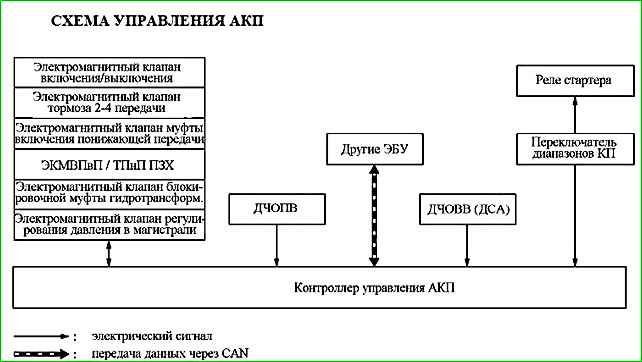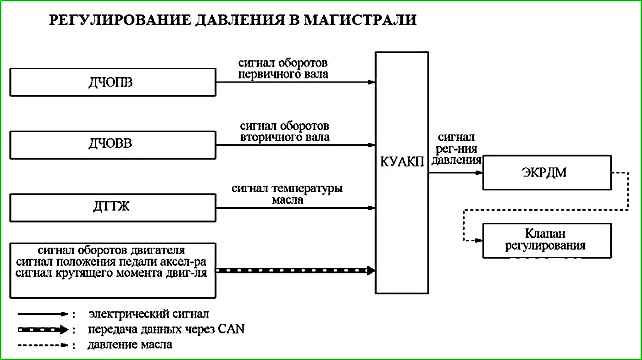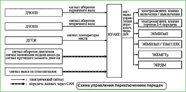 Контроллер управления АКП (КУАКП) по шине CAN получает сигнал крутящего момента двигателя от контроллера ЭСУД.