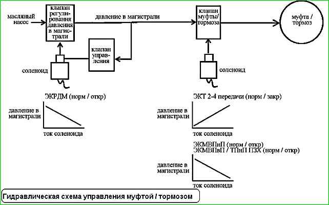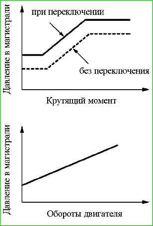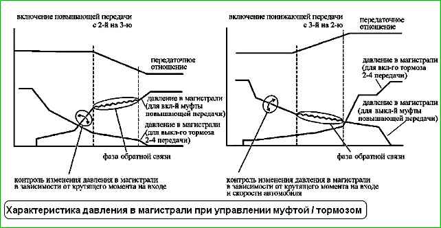 При переключении передачи давление в магистрали регулируется в зависимости от величины крутящего момента двигателя, так же давление в магистрали соответствует частоте вращения двигателя (числу оборотов двигателя).