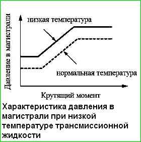 Для компенсации увеличения времени срабатывания исполнительных механизмов, связанного с падением температуры трансмиссионной жидкости ниже допустимого предела, давление в магистрали повышается до определенного уровня