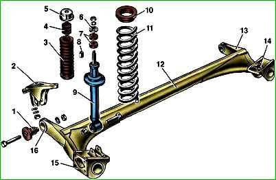 Детали задней подвески: 1 - резинометаллический шарнир; 2 - кронштейн крепления рычага подвески; 3 - кожух амортизатора; 4 - буфер хода сжатия; 5 - крышка кожуха; 6 - опорная шайба; 7 - подушка амортизатора; 8 - распорная втулка; 9 - амортизатор; 10 - изолирующая прокладка; 11 - пружина задней подвески; 12 - соединитель рычагов; 13 - рычаг балки задней подвески; 14 - кронштейн крепления амортизатора; 15 - фланец; 16 - втулка рычага