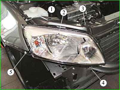 Откручиваем три самореза 3 крепления противотуманной фары к переднему бамперу 4 автомобиля и снимаем противотуманную фару.