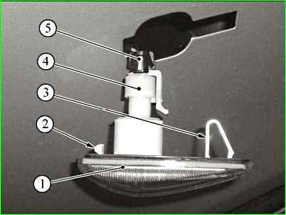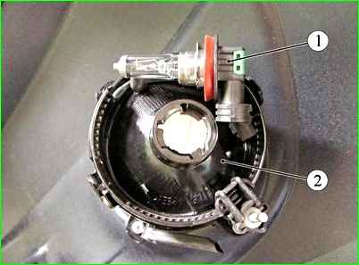- поворачиваем лампу 1, рисунок 2, против часовой стрелки и извлекаем ее из корпуса противотуманной фары.