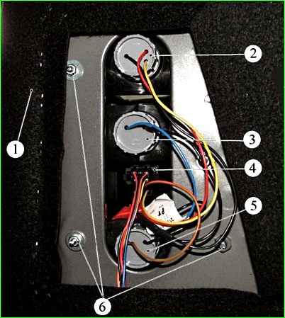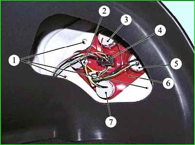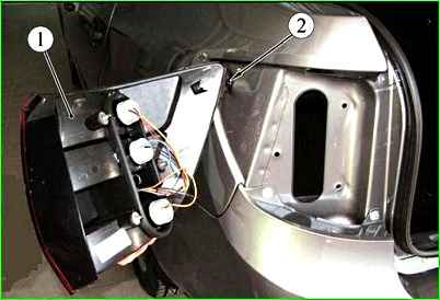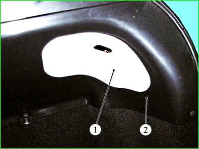 Снимаем заглушку 1, рисунок, опоры полки багажника в месте крепления заднего фонаря.