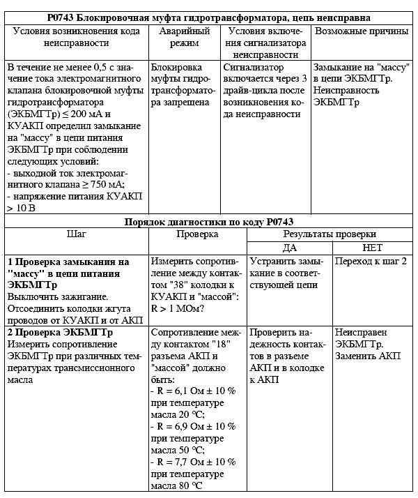 P0743 Блокировочная муфта гидротрансформатора, цепь неисправна