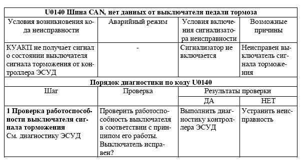 U0140 Шина CAN, нет данных от выключателя педали тормоза