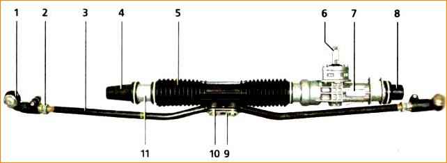 Длина рулевой тяги меняется при вращении регулировочной втулки. После завершения регулировки наружные наконечники рулевых тяг стягиваются болтами.