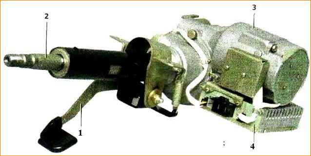 На валу двигателя установлен червяк, который входит в зацепление с пластмассовой шестерней, закрепленной на вале рулевого управления.