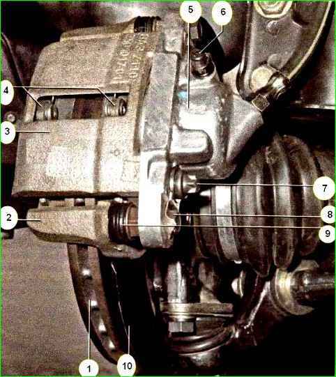 Тормозной механизм переднего колеса: 1 - тормозной диск; 2 - направляющая колодок; 3 - суппорт; 4 - тормозные колодки; 5 - цилиндр; 6 - защитный колпачок штуцера прокачки; 7- винт крепления цилиндра к суппорту; 8 - болт крепления цилиндра к направляющему пальцу; 9 - чехол направляющего пальца; 10 - щит тормозного диска