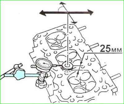 Приподнимите головку клапана на 25 мм, затем измерьте индикатором перемещение клапана по направлению стрелок (см. рис.10) под углом 90˚ к оси распределительного вала.