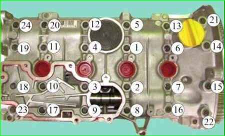 - - Затяните в указанном порядке болты крепления крышки головки цилиндров 13, 20, 22, 23 моментом 12 Нм.