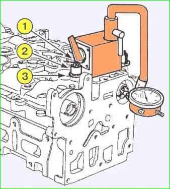 Закрепите магнитную стойку приспособления для проверки осевого зазора Mot588 на головке блока цилиндров, используя для этого крепежную планку (3) приспособления Mot588, притяните ее болтами (1) крепления маслоотделителя и распорными втулками (2), имеющими следующие размеры (см. рис. 16):