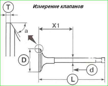 * диаметр D1 стержня клапана измеряется на расстоянии X1