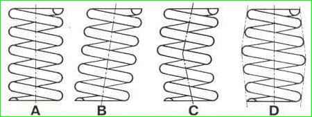 При деформациях B и C эксплуатация пружины допустима, если отклонение от вертикали не более 1,2 мм, при потере формы (D) — пружина подлежит замене.