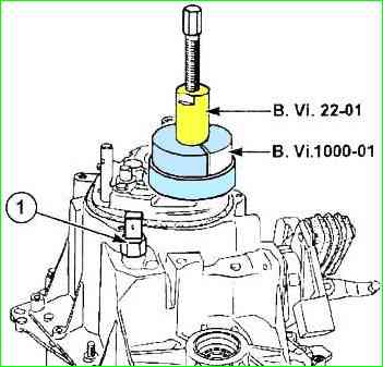 Извлекаем ведомую шестерню пятой передачи с помощью трехпалого съемника или с помощью приспособлений B.Vi. 22.01 и B.Vi.1000-01 (см. рис. 10).