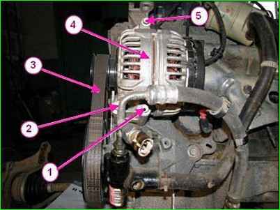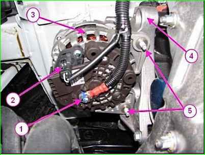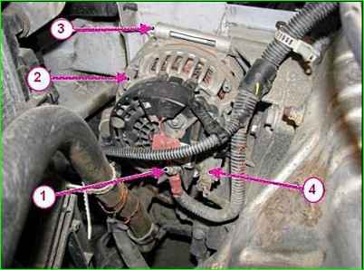 Снимаем защитный колпачок с гайки 1 и отсоединяем от генератора 2 колодку 4 жгута проводов панели приборов.