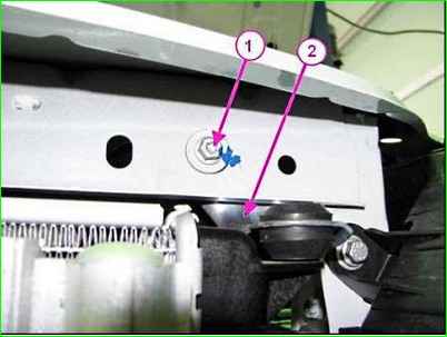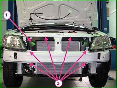 Отворачиваем головкой на 10 верхние болты 1, крепления кронштейна радиатора к кузову автомобиля