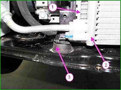 Извлекаем радиатор 1 системы охлаждения двигателя в сборе с конденсором 2 кондиционера из нижних креплений 3, и сдвинуть его в направлении левого крыла автомобиля