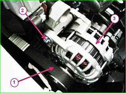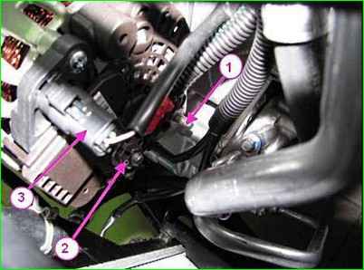 Снимаем защитный колпачок с гайки 1 и отсоединяем от генератора 3 колодку 2 жгута проводов.