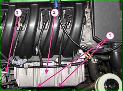 Отворачиваем две гайки 1, крепления защиты топливной рампы и снять защиту 2 топливной рампы.