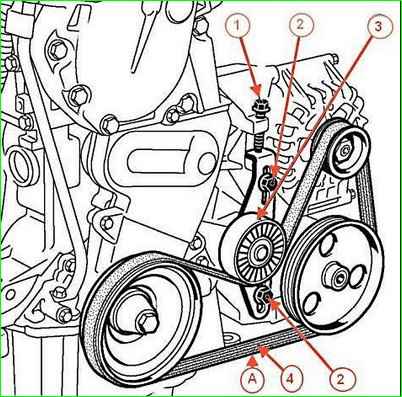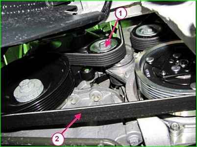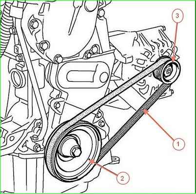 Установить новый ремень 1 и повернуть шкив коленчатого вала головкой на 18 до полной установки ремня.