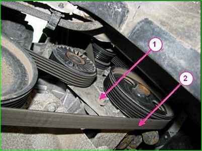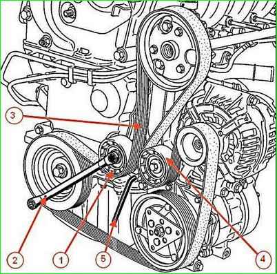 Маркировка ремня привода вспомогательных агрегатов автомобиля с гидроусилителем руля и без кондиционера — 5К1110 (пятиклиновой, длиной 1110 мм). При замене ремня необходимо также заменить его натяжной ролик.