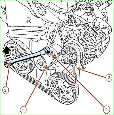 Накидным ключом на 16 поворачиваем натяжной ролик 1 по часовой стрелке.