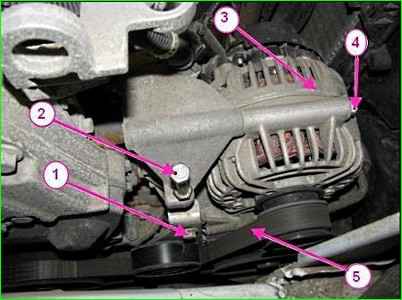 Отворачиваем и извлекаем верхний болт 5 крепления генератора к кронштейну.