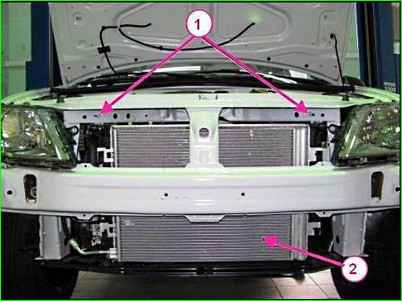 Отсоединяем кронштейны 2, крепления радиатора от радиатора