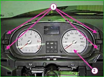 Отвернув четыре винта 1 крепления комбинации приборов, и извлекаем комбинацию приборов из панели приборов
