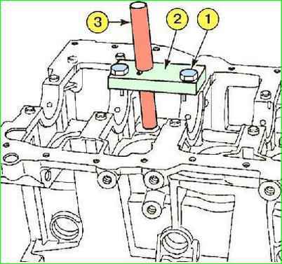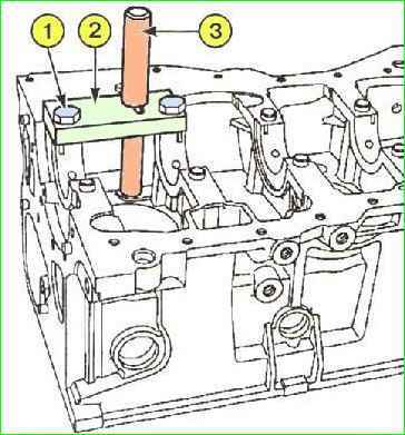 Установка форсунок цилиндров 2 и 4: 1 - болт крепления; 2 - пластина; 3 - кондуктор