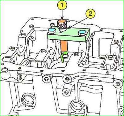 Установите на блок цилиндров пластину (2) приспособления Mot.1494, не затягивая два болта крепления (1) (см. рис. 1 и 2).