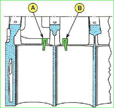 Проверьте, правильно ли ориентированы форсунки охлаждения днищ поршней. Метка «А» соответствует форсункам цилиндров 2 и 4, а метка «В» соответствует форсункам цилиндров 1 и 3 (см. рис. 5).